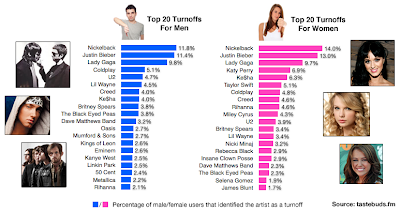 Tastebuds, se tomó el trabajo de pedir a sus usuarios que listen 12 actos que los llevarían a escapar al enterarse que su cita los tenía entre sus favoritos y detrás de Nickelback, se encuentran el también canadiense Justin Beiber, las cantantes Lady Gaga y Ke$ha, las agrupaciones de estadio Coldplay y U2, los post-grungers Creed, las estrellas pop Katy Perry y Britney Spears y el rapero Lil Wayne.